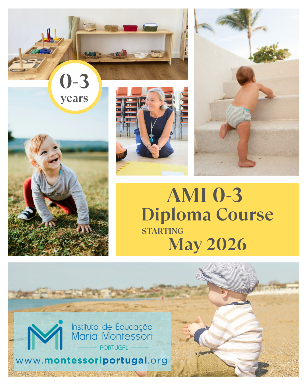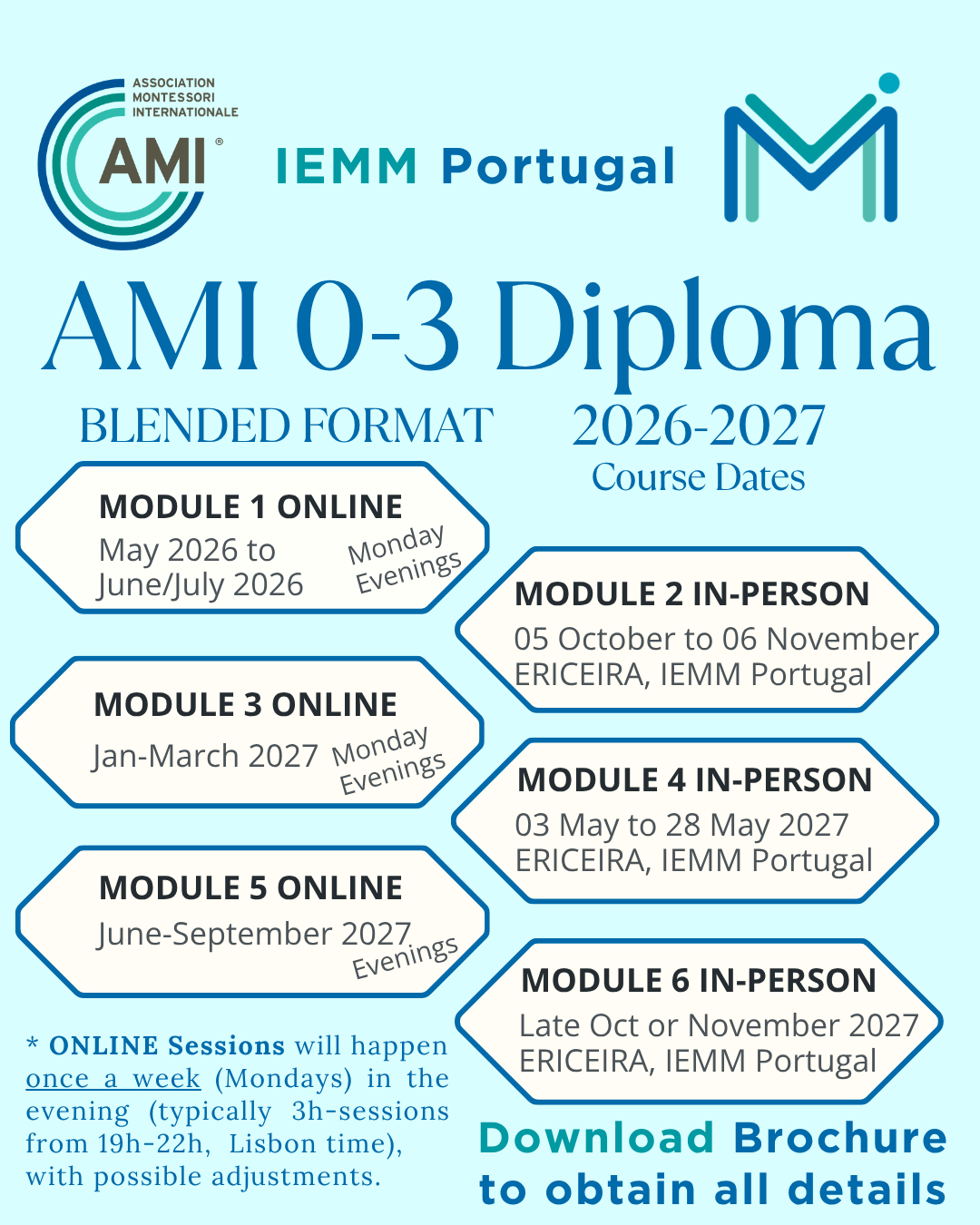 Este Curso (Diploma AMI 0-3) tem um formato BLENDED (online e presencial), com 3 módulos presenciais intercalados com 3 módulos online (ver ao lado).